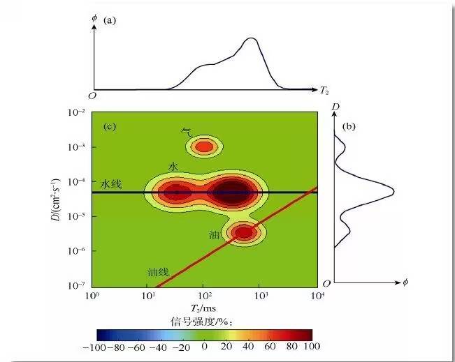 图3.孔隙中不同流体的二维核磁共振信号分布