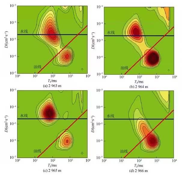 图3所示的T2—D谱图中,水线位置与温度、矿化度有关,水的扩散系数随温度增加而变大,随矿化度增加而减小;油线位置与油的勃度有关,随勃度增加扩散系数变小。通过特殊的反演处理技术即可将包含在横向弛豫时间内的扩散系数信号分离,从而实现在二维空间内进行流体性质识别。