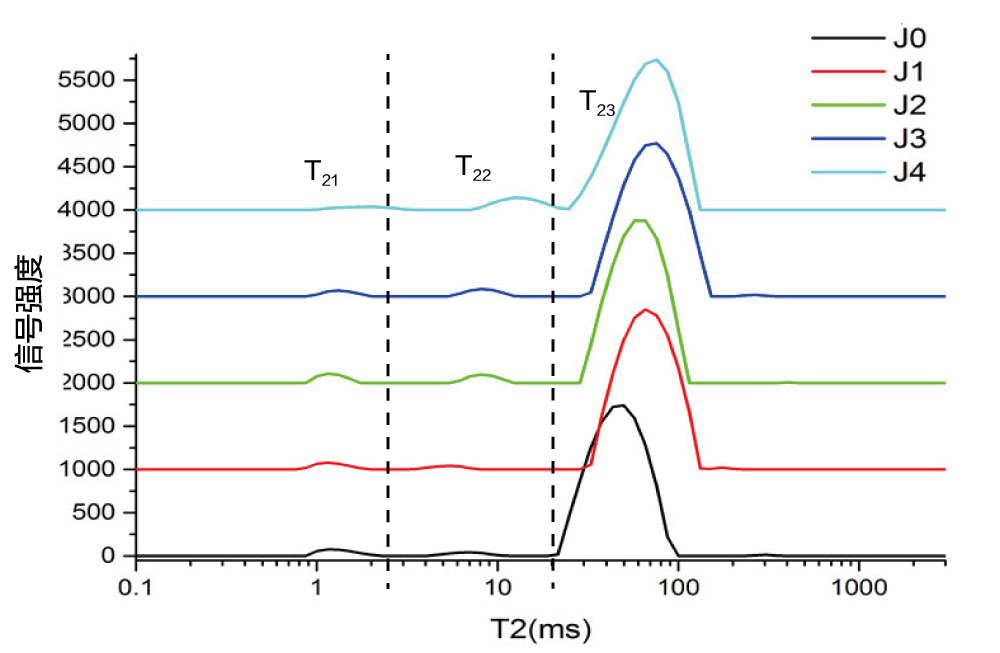 注:J0-J5为不同超声波辅助压力处理;T21为结合水,T22为不易流动水,T23为自由水;