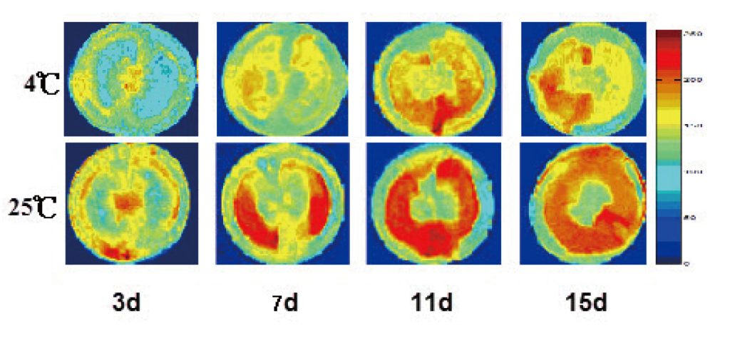图3. 不同储藏温度对圣女果储藏过程氢质子密度加权成像的影响