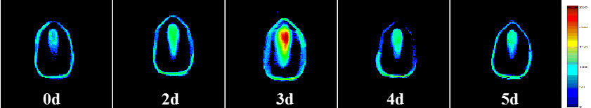 蓝莓4℃储存,其水分含量不断流失, 7天内水分含量变化较小,14天开始发现显著减少,T23峰面积(A23)和总面积A总逐渐减少,成像逐渐变暗和浅。