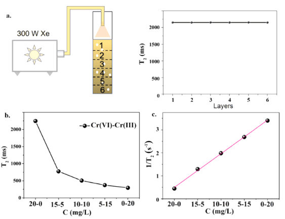 通过光还原过程,高毒性的Cr(VI)可以在TiO 2、ZnO、CdS和MoF等光催化剂上还原为低毒的Cr(III),这可以被视为一种简单、清洁和方便的策略。通常认为溶液中铬的光还原是一个均匀过程。然而,在真实的宏观反应系统中,光还原过程中经常发生沉淀和分层。因此,反应系统中的光还原过程比均相反应系统中的光还原过程更加复杂。深入了解不同深度反应系统中的光还原过程,可以极大地促进高性能光催化剂的设计。如何在不同深度上监测反应系统中的光还原过程引起了该领域的许多研究兴趣,低场核磁共振技术在这一过程中展示了极大的应用潜力。