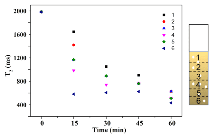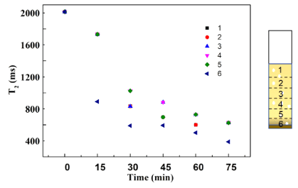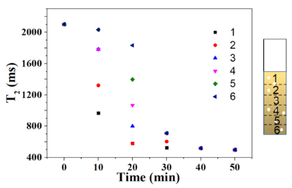 图2  根据照明时间绘制样品不同层的横向弛豫时间(T 2)。实验中使用了Pt/CN光催化剂。实验条件:光催化剂重量¼5 mg,六价铬浓度¼20 mg/L,全波段光照射。